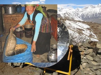 Cuiseur solaire parabolique et la boîte à chaleur maintenue utilisé dans les villages de montagne au Népal