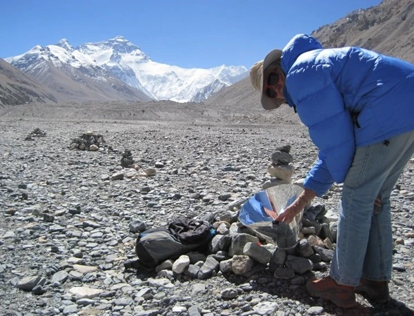 Allart Ligtenberg au camp de base de l'Everest avec son cuiseur solaire parabolique pliant (poids de 3 kg, 1 m de diamètre)