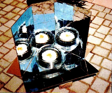 J'ai appelé ce cuiseur «Tout d'une pièce» parce qu'il est fabriqué à partir d'une seule plaque de carton. Plié, il occupe un espace de 81 x 51 x 1 cm ( et pèse 710 g). Si l'on utilise du carton lisse, on peut y coller directement de la feuille d'aluminium. Avec du carton ondulé, il est préférable de coller l'aluminium d'abord sur du carton lisse que l'on colle ensuite sur le carton ondulé, cela pour éviter l'apparition de cloques sur la surface réfléchissante.