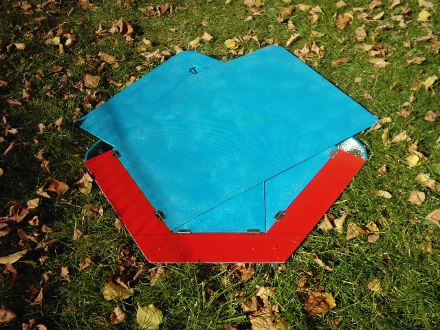 Ce cuiseur est constitué de quatre panneaux réfléchissants plans qui concentrent les rayons solaires sur une sauteuse avec couvercle transparent en Pyrex. La sauteuse est placée sur un dessous en bois qui repose sur un panneau réfléchissant horizontal.