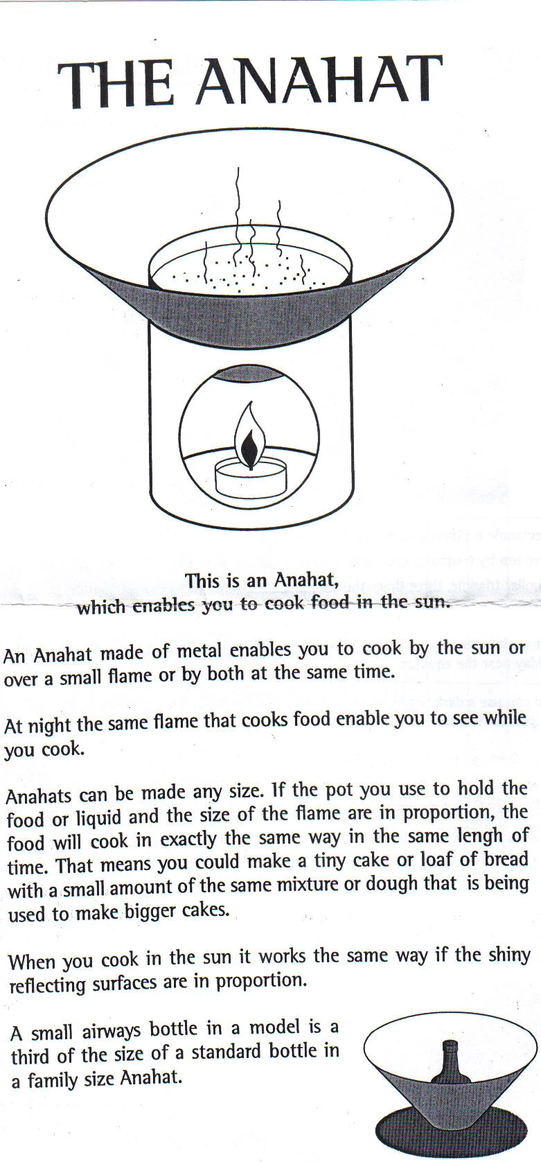 Anna Pearce has modified the cone shaped hat of the far east regions into a multipurpose device which can be used as hat (headwear), as a vessel to cook food and carry water, and also as a cone-type solar cooker called the Anahat solar cooker.