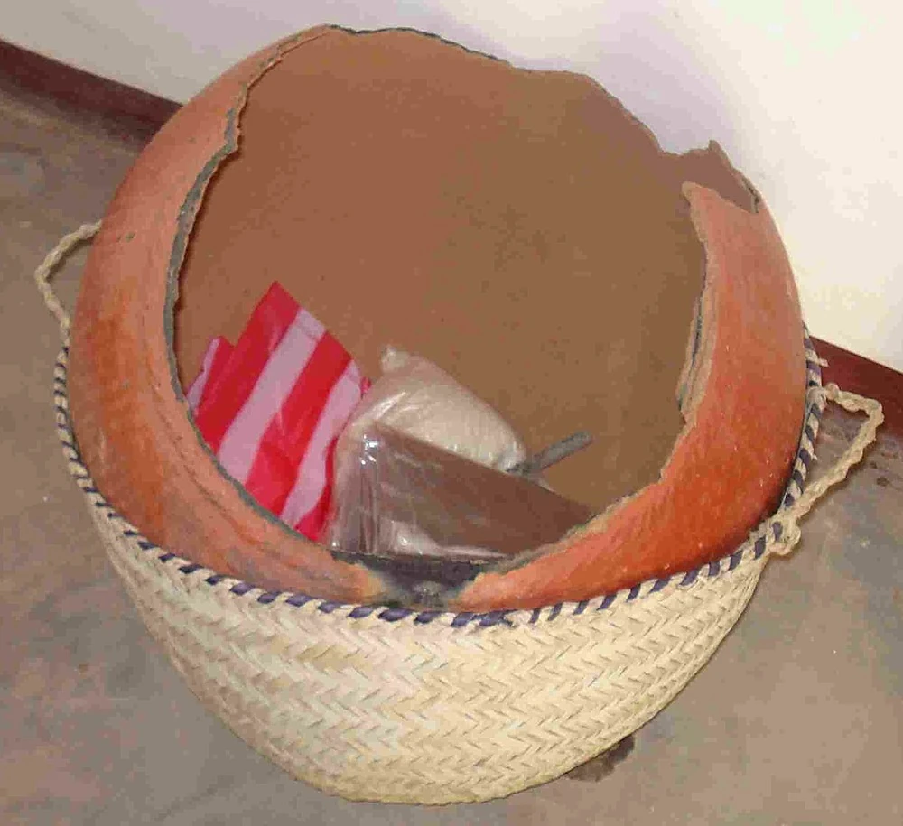 The water pot called “Borma” is made and used throughout Darfur Sudan. It is a thin clay pot fired to make it water proof. It is very hard and brittle and resembles a large eggshell with a neck. I found a broken pot in the market for less than a dollar and removed the broken "neck" part by cutting and chipping until it provided a fairly even lip.