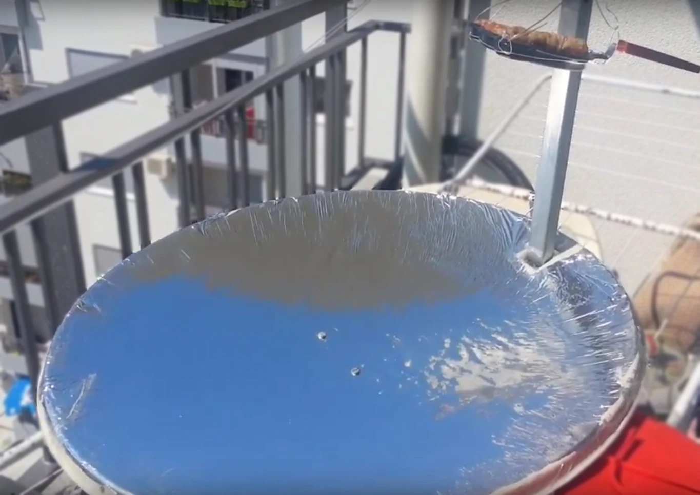 - July 2015: Bozina converted an old satellite dish to a solar grill. The reflective material used for this project was a Mylar blanket. This is very cheap material that has good reflective parameters. Because the reflective area was not very large, Bozina used a small cooking pan. The cooking area was small, but was hot enough to grill three kebabs perfectly. The kebabs were delicious.