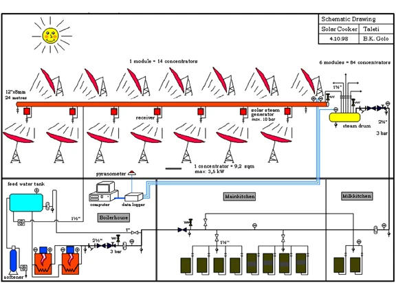 The system works on the thermo-siphon principle so that each concentrator's well-insulated header pipe itself acts as a steam reservoir, obviating the need for a separate steam generator, heat exchanger or electrical back-up for circulation pumps, and thereby increasing efficiency and preventing disruption by power cuts. The day-to-day operation and maintenance of the system is easily handled by a team of three local residents.