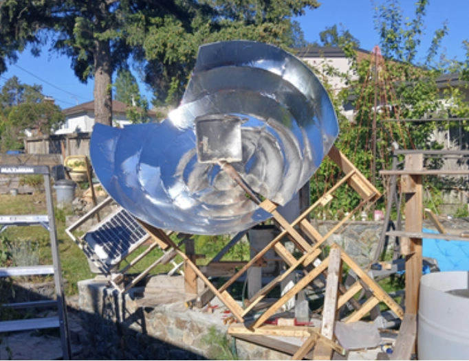 - February 2025: Tracking solar cooker project is finalist - Brian White has been notified by Autodesk Instructables his solar tracking device has made it to the final round of judging in the annual competion. He explains his lo-tech design is aimed at gardeners, which he refers to as an untapped market. It can used for sterilizing potting soil and processing weeds and vegetation. They go straight to good mulch in a single day without needing a compost heap. His goal was to simplify the tracking approach traditionally used with Scheffler Community Kitchen systems. Read his submission...