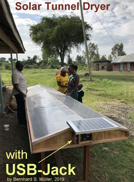 - January 2022: Solar tunnel dryer design for Kenya and Uganda: - Bernhard Müller offered his design skills in helping to create a new solar tunnel dryer for his partners in Kenya and Uganda. A 10W solar panel powers a fan providing air flow, and enables the people who work with the dryer to charge their phones simultaneously.