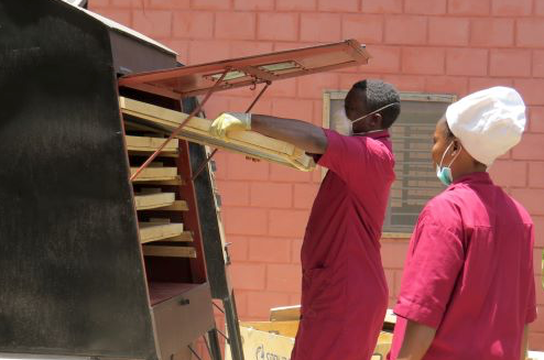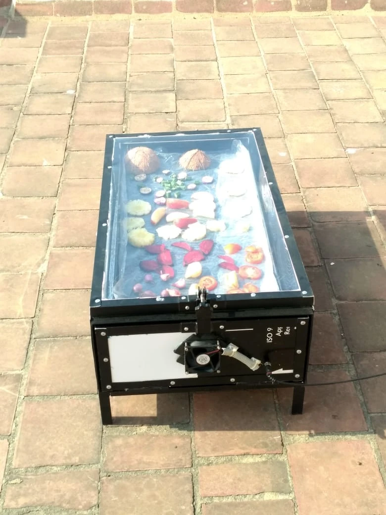 - October 2023: Solar food drying - Clement Musonda reports Rosa Solar Stoves has begun experimenting with their new version of an updraft solar food dryer. With this design, the hot air flows upward through an extended lower level solar heat collection trough, and enters the bottom of a cabinet underneath the food. Sliced food is added on screen trays from the rear of the cabinet. The dry air rises through the trays and around the food, exiting through a vent at the top. It appears their design also includes a solar PV panel to power a fan to move more air through the drying chamber.