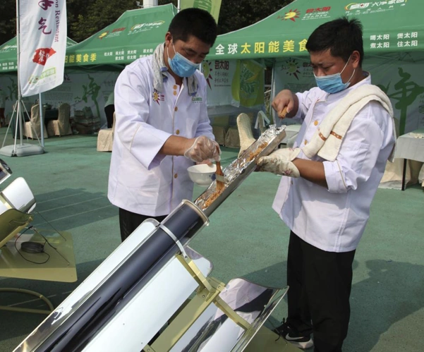 - August 2018: Solar cooker demonstration in Dezhou - Two dozen chefs with white aprons and hats prepared soups, baked "baozi" pork buns, and boiled rice porridge at a festival designed to demonstrate the potential of solar cookers that organizers claim can help reduce climate-changing greenhouse gas emissions. As hundreds of people strolled by, chefs armed with oven mitts scaled ladders to uncover piping-hot cooking tubes arrayed on nearly 2-meter (6-foot)-tall industrial racks. Smaller-scale vendors used 1-meter (3-foot)-long solar cookers designed to fold up for picnics. Read more...