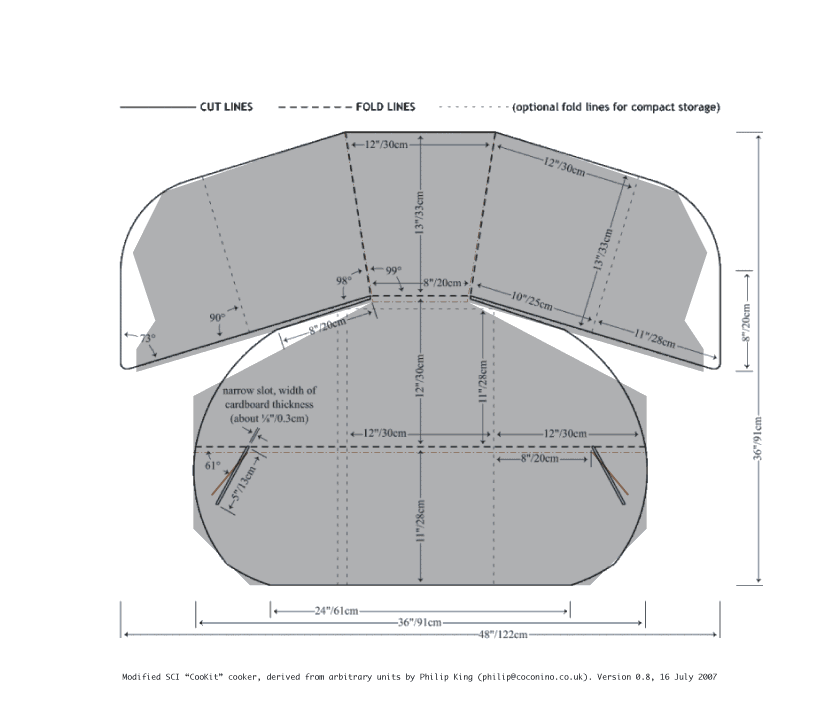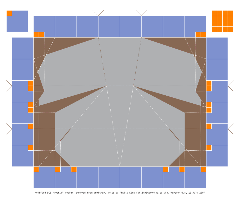 I've made one CooKit and wanted to make more, but each time I've looked at the published plans I've found that they don't suit my way of thinking. I also find them difficult to scale to suit an arbitrary size of material. So, and in case there are others like me who get dizzy looking at all those angles and inches and centimetres, I've drawn my own design with the following intentions: