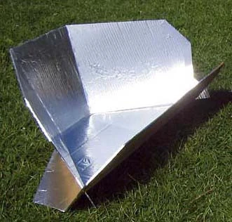 It involves cutting a typical cardboard box (about 0.6 x 0.6 x 0.3 m, or 2 x 2 x 1 ft) in half diagonally. Then add a cardboard flap in front and cover the inside with tinfoil.