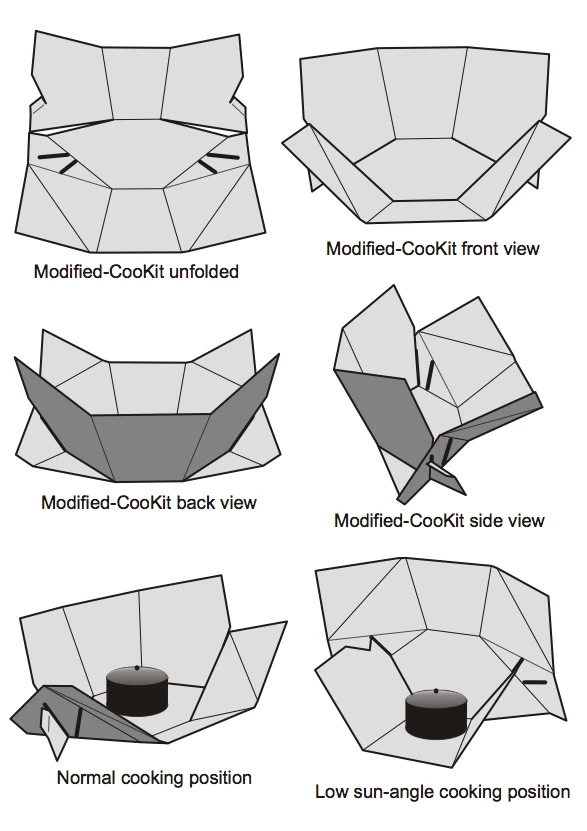 relocated so that the two sides of the front reflector can be tilted to reflect more sunlight towards the desired direction. The modified CooKit is structurally more robust, and can be positioned upside down to cook when the sun angle is low. The cooking pot receives more reflected sunlight under the normal operating range of the cooker. The modified CooKit can be folded down into a small package for easy transportation and storage just like the original design. Review more of Teong's description at: