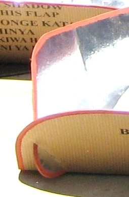 To remedy the moisture problem inherent in a product made of cardboard, the Solar Cookers International East Africa Office and colleagues have added notebook binding tape, also readily available in large cities or capitals to seal steno notebooks for students. |