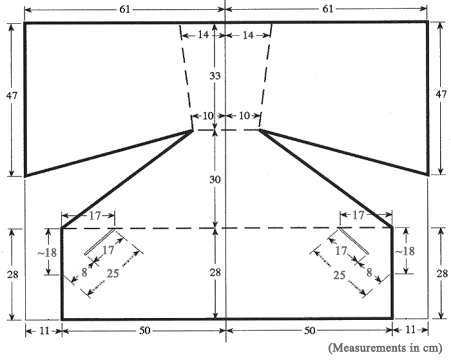 Solar Cookers International's standard CooKit calls for a lot of curves, which can be hard to make with a hand held blade. Juan Urrutia Sanz of the Manos Unidas organization in Spain writes that his group promotes a variation on the CooKit shape that is easier for many people to make at home. The Manos Unidas version, called Cocinsol II. Señor Urrutia y Sanz reports that it cooks as well as the CooKit and actually has more reflective surface area. SCI's Jay Campbell agrees. Jay is an engineer who has chaired the SCI Research Committee and who worked on engineering the CooKit for manufacture in Kenya. (One key advantage of the CooKit's curved shape is that it is easier to figure out a way to fold it into an album-sized package for easy storage and transport.) To make your own Cocinsol II, use the shape and dimensions shown in the graphic. Cardboard is an inexpensive material to use which holds its shape and is also easy to fold. However, woven mats or baskets, molded plastics or wood can be used. The solid lines in the design show where to cut; the dotted lines show where to fold. Cover the surfaces of one side with shiny material such as aluminum foil or shiny gift wrap (which will reflect light to the pot at the center of the cooker).