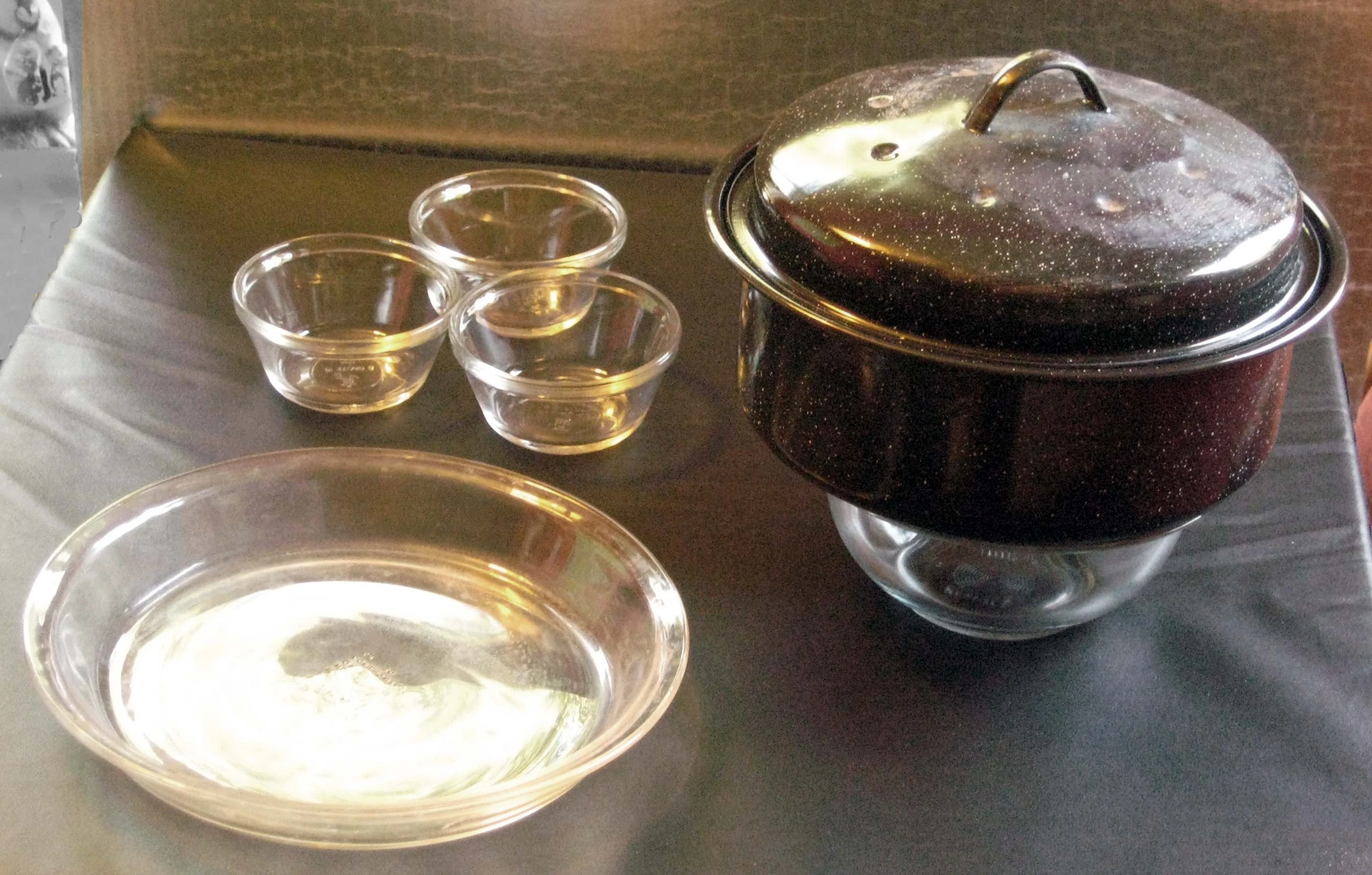 Glass bowls and pie pans can be used to raise the pot off of the bottom of the cooker (note that the pot would normally be enclosed in an oven cooking bag when using a panel cooker). In some cases, they may provide more stability used upside-down. |