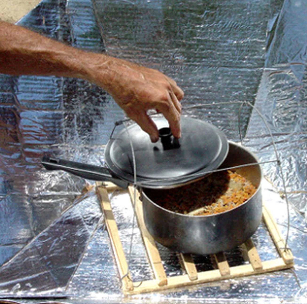 Dr. Steven Jones found that raising the pot on a wire frame improved cooking in a panel cooker. It is also possible to set the pot on a clear glass bowl. |