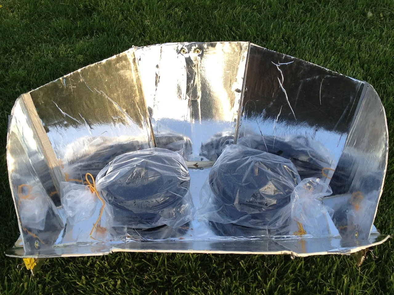 The Haines Solar Cooker is made of IXPE (cross-linked polyester) foam insulation bonded with reflective metalized polyester film (MPET film / 3mm IXPE foam / white PET film). The reflective polyester will not oxidize, cannot be scratched off, and has a high melting point. Importantly, the new material is easy to recycle and is environmentally safe through the whole production and recycling process without pollution. In the USA, this material is used to make high-end auto windshield sunshades.