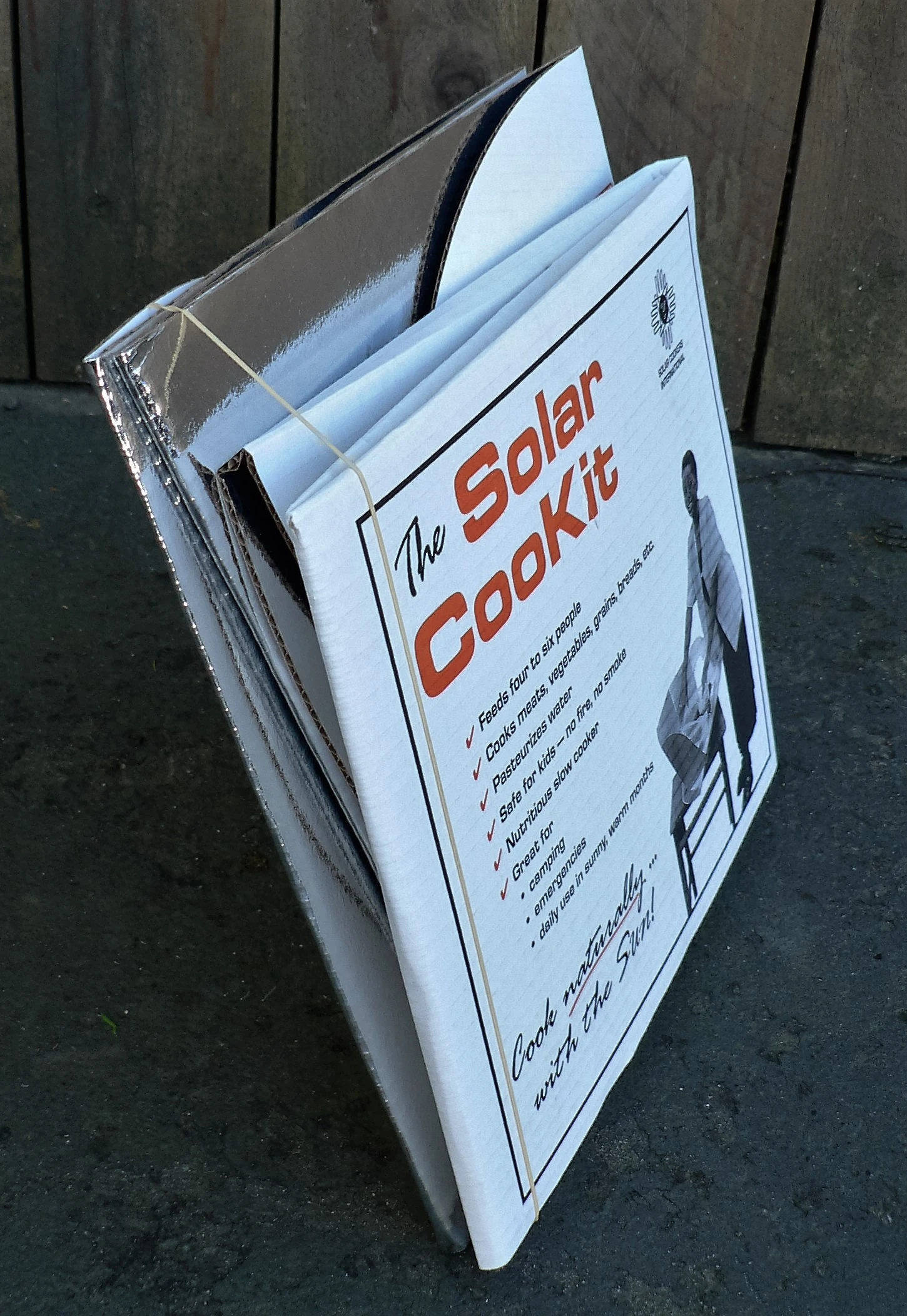 The CooKit is made of cardboard and foil shaped to reflect maximum sunlight onto a black cooking pot that converts sunlight into thermal (heat) energy. A heat-resistant bag (or similar transparent cover) surrounds the pot, acting like a greenhouse by allowing sunlight to hit the pot and preventing heat from escaping. It weighs half a 0.5 kg (1.1 lbs) and folds to the size of a large book for easy transport.