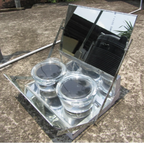 The cooker uses a 'suitcase' style enclosure, with mirror main reflectors at the back and front lip. Both of these reflectors can be adjusted for maximum solar gain. The base of the cooker is polished aluminum to aid light collection. It is suited to using two cook pots at the same time. The stainless steel and aluminum construction materials should make the cooker quite durable.