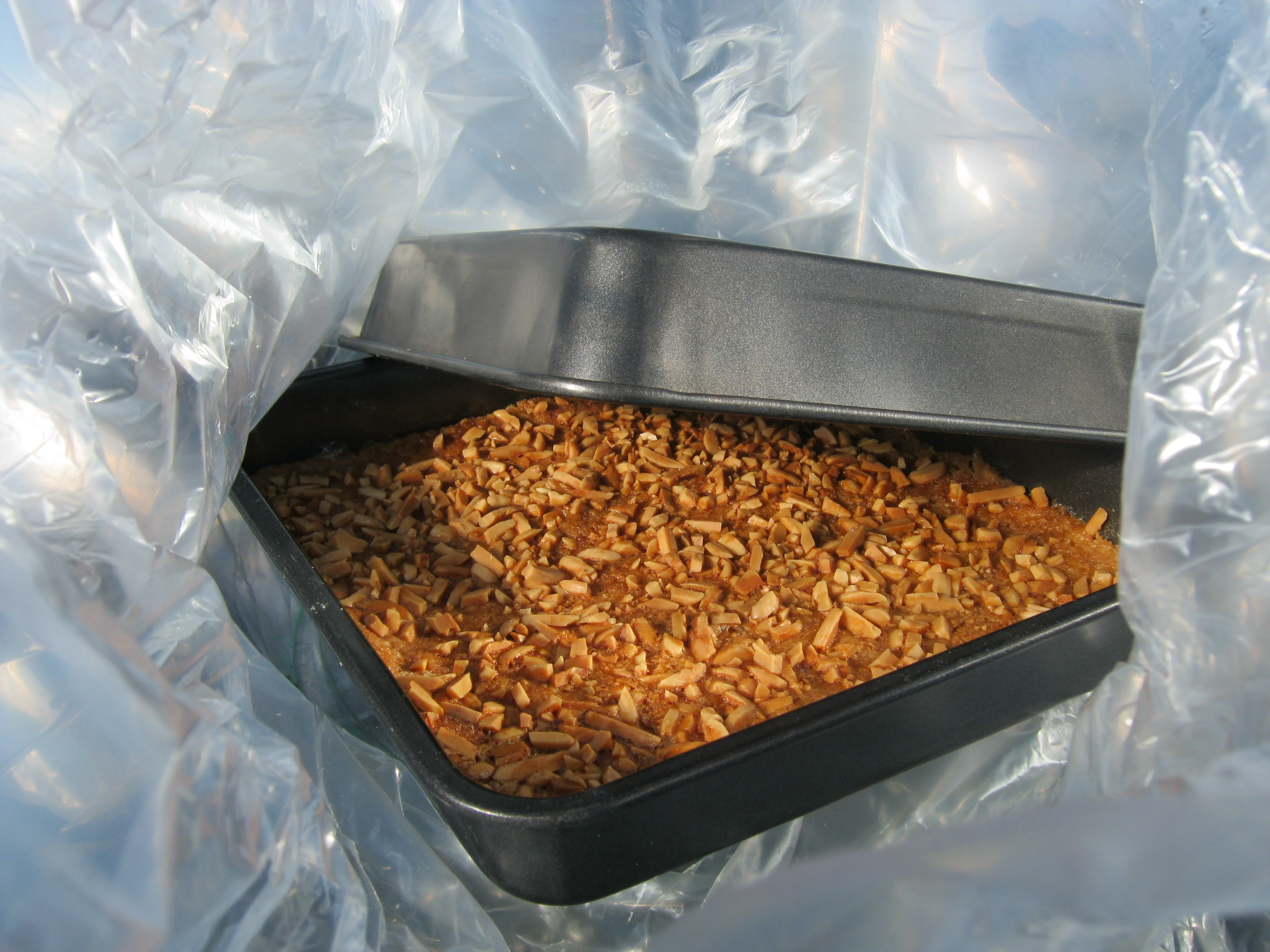 You will need a solar cooker that can take a 13"x9" pan for this one (CooKit works very well), and you will need a pan of a matching length and width to use upside down for a lid. You can use two 13x9" cookie sheets if they are not too shallow, or use a 13x9" cake pan for the bottom and a cookie sheet for the lid.
