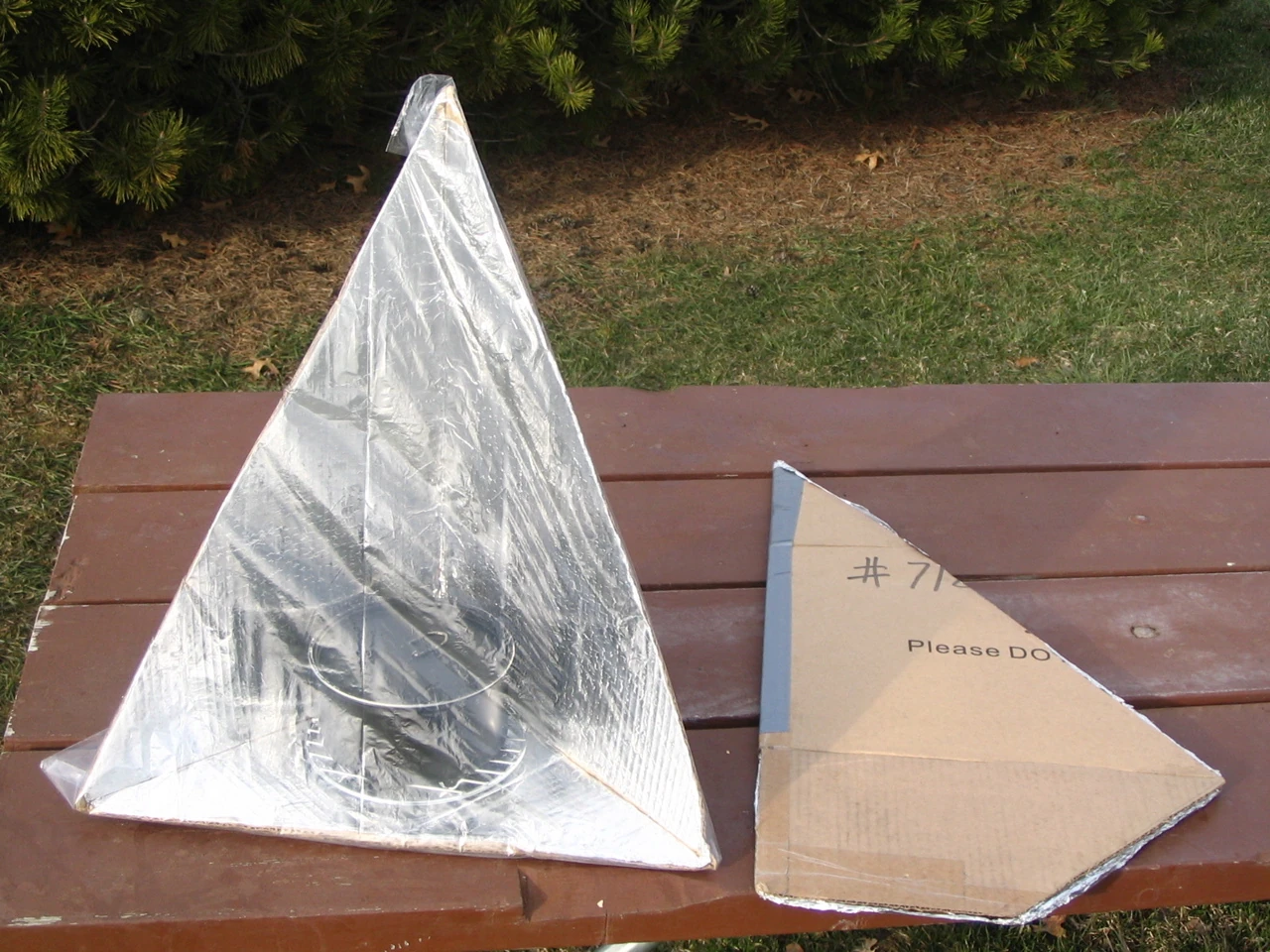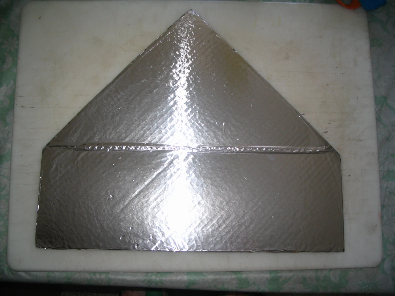 To increase the efficiency of an EZ-3, a small front booster panel can be made by tracing the bottom of the cooker on a flat piece of cardboard and marking a rectangle the width of the cooker and seven-ten inches deep (the farther south, the more front booster is needed). Cut out this triangle+rectangle shape (it will look a bit like a child's outline of a house) and score a fold along what would be the front edge of the cooker (between the triangle part and the rectangle part) and foil it.