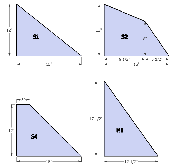 Scale drawings of side-view for four EZ-3 models. N1 is the original northern model, designed at 47N. S1, S2, and S4 all work better farther south, when tested a little below 38N, esepcially with a simple additional black bottom piece.