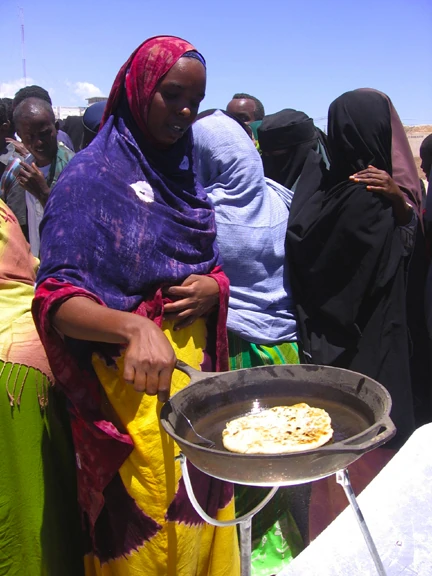 A woman involved with the Sun Fire Cooking project cooks flatbread in a parabolic solar cooker in Somalia.
