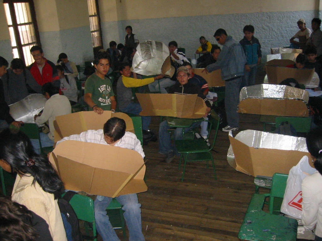 - November 2012: At the invitation of Solar Cookers International, Rodrigo Carpio of Fundación Inti Uma Ecuador built a "Minimum Solar Box Cooker" and exhibited it for the first time on Earth Day in 1990. Thus began the "Green Decade" (1990-2000) in Ecuador. We took the path of the sun and created the foundation INTI UMA, Quechua words that evoke, for our actions, the illumination of the mind in the warmth of the heart. We attended the International Congress of solar cookers SCI sponsored and organized in Cuenca, Ecuador and the Second Conference for Latin America and the Caribbean in 1997. We have conducted 230 rural and community workshops to teach the making and using of solar cookers. We have taught students at the College Benigno Malo (approx. 5,000) and the University of Cuenca. We investigated appropriate designs equatorial sun oven Inti Churi (Son of the Sun), fruits and food dehydrator; Three in one hub - paraboloid - furnace, "Sunflower" hub; Oven José Sol, multi reflector, and recreation of the Solar CooKit. However, we have not developed self-sustaining projects due to lack of funding. In Ecuador LPG is subsidized, masking the real cost of cooking gas. The current petroleum bonanza in our country results in the inability of our government to understand the urgent need to replace fossil fuels with renewable energy.
