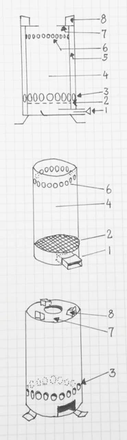 First, the gasification process will be explained in this paper: it is called pyrolysis and stems from the Greek words pyr (fire) and lysis (solution). The dry biomass releases wood gas under the influence of heat and absence of air. At the end of the process, charcoal remains for further applications. In contrast to carbonization in a kiln or carbonizer, the wood gas (smoke) is used for cooking purposes, emitting very low carbon monoxide (CO) and particulate matter (PM) exhaust gases. This distinguishes the great advantage of gasifiers. They can replace dirty combustion methods like 3-stone fires or charcoal stoves. Gasifier fumes are almost harmless (under ideal conditions and when the device is operated correctly!), allowing indoor cooking. Gasifiers save fuel. Example: to bring 5 liters of water to a boil, >1.3 kg of wood needs to be burned to ashes in a 3-stone fire. By utilization of a gasifier, just 0.45 kg of dry biomass do the same job - with 53% less fuel. As a bonus, the gasifier leaves 90 grams of charcoal, which is called "biochar" to indicate the production difference. A basic model of a gasifier, like the one described in this paper, has a thermal transfer efficiency of 50% to 55%. The sketches explain the gasifier. First the entire device is displayed, below you will see the reactor (inner cylinder) and then the outer shell construction.