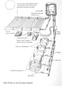 Gaviotas is a 200-person sustainable living community based in Colombia. In the hospital, a community solar cooker has been installed. It consists in an exterior hole tube solar collector, located in the building's roof, where cotton seed oil is heated. In sunny days, the oil may reach 180 ºC. In the storage tank, the difference in temperature creates a natural circulation: hot oil is sucked in the tank while colder oil, lower in the tank, goes into the collector to be heated. The tank includes two more holes (a superior inlet and an inferior outlet) to allow for oil transportation to the building. To take the heated oil to the interior of the building, a little 40 w pump (solar powered by the photovoltaic collectors and battery system) is used. The oil passes through 6 coils that surround the stainless steel pressure cookers where cooking takes place. Then, cool oil comes back to the storage tank. Both the tank and the pipes are thermically insulated. The oil is kept hot so it is possible to cook at night or in bad weather conditions (clouds, rain).
