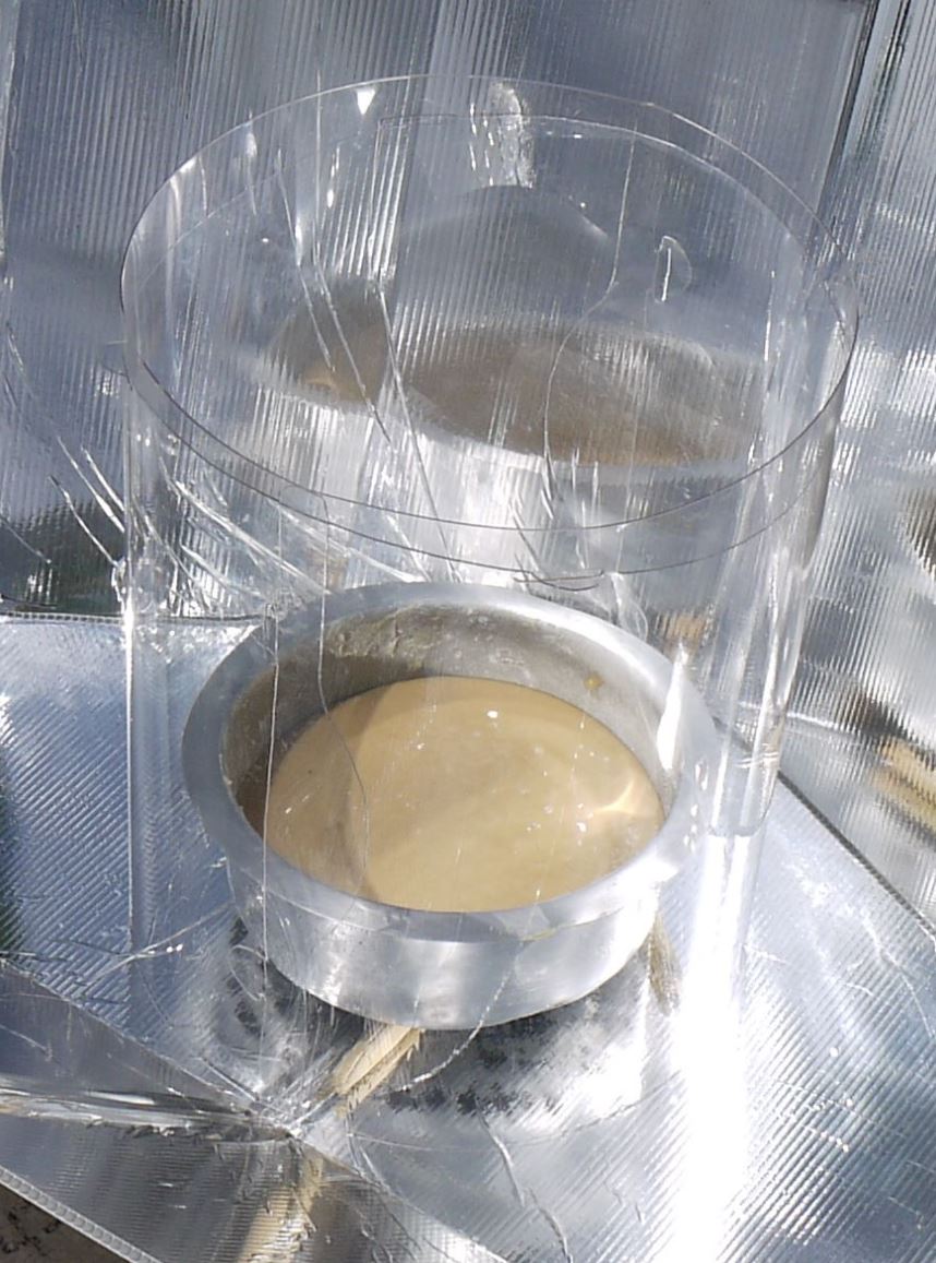 Sharon Cousins, who cooks in northern Idaho at 47 degrees north, high on a southwest facing ridge that is open to a fifty mile sweep of the prevailing winds, has put together several rigid cover options that do not risk damage to her cookers. One of her favorites is a one-gallon clear Pyrex bowl/casserole for the bottom and a large clear acrylic bowl for the cover. This will take her one-gallon black-painted enamel pot, her round graniteware roaster, and various other pots, and performs much better in cold or windy conditions than an oven bag. It also gives easy access to the food which is particularly helpful if the food will be improved by giving it an occasional stir (rice pudding, for example) or if foods will be added to the pot later in the cooking process (adding tender vegetables after tougher ones have begun to soften). A raised grate underneath allows light to strike the bottom.