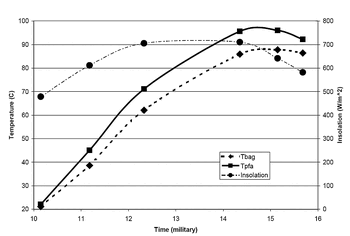 Andreatta performed side-by-side solar cooker tests of the plastics, in which two identical black pots were filled with equal amounts of water. One pot was placed in the standard PP bag and cinched at the open end. The other pot was wrapped with the PFA sheet as follows: the sheet was centered on the top of the pot and wrapped beneath the pot in such a way that the weight of the pot held the bottom of the sheet closed, preventing most air leaks. (Any air leaks would be under or near the bottom of the pot where little warm air escapes.) Both pots were then placed in CooKits and exposed to sunlight. Temperatures were measured throughout the day using thermocouples located approximately in the center of each pot. The cookers were re-oriented twice during the measurement period. As the graph shows, the water in the PFA-wrapped pot rose to a higher temperature faster and held that temperature longer.