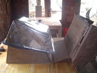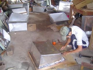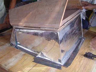 Box cookers: In partnership with Dutch organization Solar Cooker Workgroup Sliedrecht NL, we have developed a new lightweight solar box cooker for use in Vietnam. The previous SLS solar box cooker was made from wood, which was increasingly difficult to purchase in Vietnam. The new cooker is made from aluminum sheets that are shaped using two molds, one for the inner box and one for the outer box. It weighs only 12 kg.