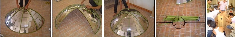 Parabolic cookers: Besides making our present parabolic cooker, we have been asked to design a parabolic cooker easy for transport. We used the same mold of our present parabolic cooker (1.30m) and divided it into four parts. It took some time, but we came up with the cooker you see in the pictures below. We also made the stand foldable. The new four-part parabolic cooker is working well and weights only 23 kg. It fits in 100 x 80 x 20 cm carton boxes, which is good for transport. The deaf workers were very excited when we got some orders from Canada and Holland.