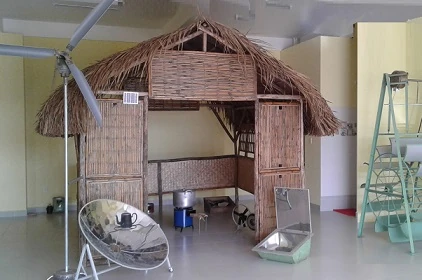 October 2017:[Solar Serve News No.53] We have built a small cottage in our research & display center. A windmill was placed in front and our waterwheel beside for supplying electricity. We filled the cottage with a few clean cookers, a solar lamp and a parabolic and box cooker in front. It became a great spot to show our work and to take pictures with our visitors.