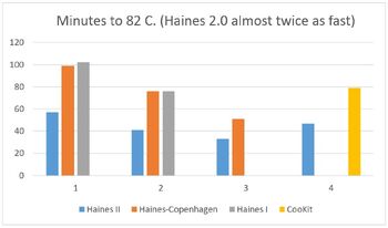 Significantly, the new Haines 2.0 reached 100 °C (212 °F). every day of testing, despite clouds, wind, or cool temperatures that caused the other cookers sometimes to “top out” between 82–92 °C (180–198 °F). For that reason Haines selected 82 °C (180 °F) as the temperature to compare the cookers.