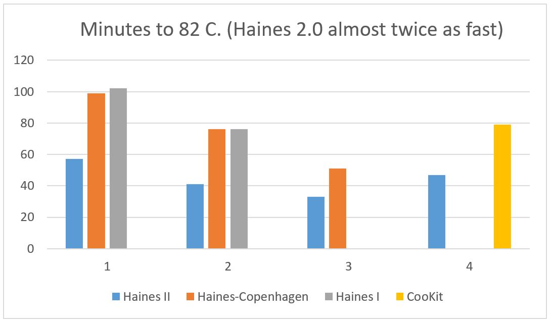 Significantly, the new Haines 2.0 reached 100 °C (212 °F). every day of testing, despite clouds, wind, or cool temperatures that caused the other cookers sometimes to “top out” between 82–92 °C (180–198 °F). For that reason Haines selected 82 °C (180 °F) as the temperature to compare the cookers.