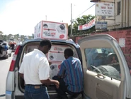 February 25, 2010: With hundreds of thousands of Haitians homeless and living in tent camps, Sun Ovens International is continuing to place as many ovens in camps as possible. In late February, Paul Munsen traveled to Haiti and initiated distribution and training in seven tent camps. A committee was formed in each camp to determine who would receive the Sun Ovens and look for ways to increase utilization. At each location many people who were not able to receive a Sun Oven pleaded for additional ovens. For additional information about Sun Ovens International's work in Haiti, click here. As shown in the photos below, camps are in open fields, schoolyards or anywhere space is available. Previously trained staff from Programme Energie Solaire of the Free Methodist Inland Mission have been employed to conduct training sessions. Paul Munsen loaded his rental car with ovens to take to the camps where he met with a camp committees. Training on the use of WAPIs for water pasteurization was also provided. Children and adults were eager to learn how to cook with the sun.