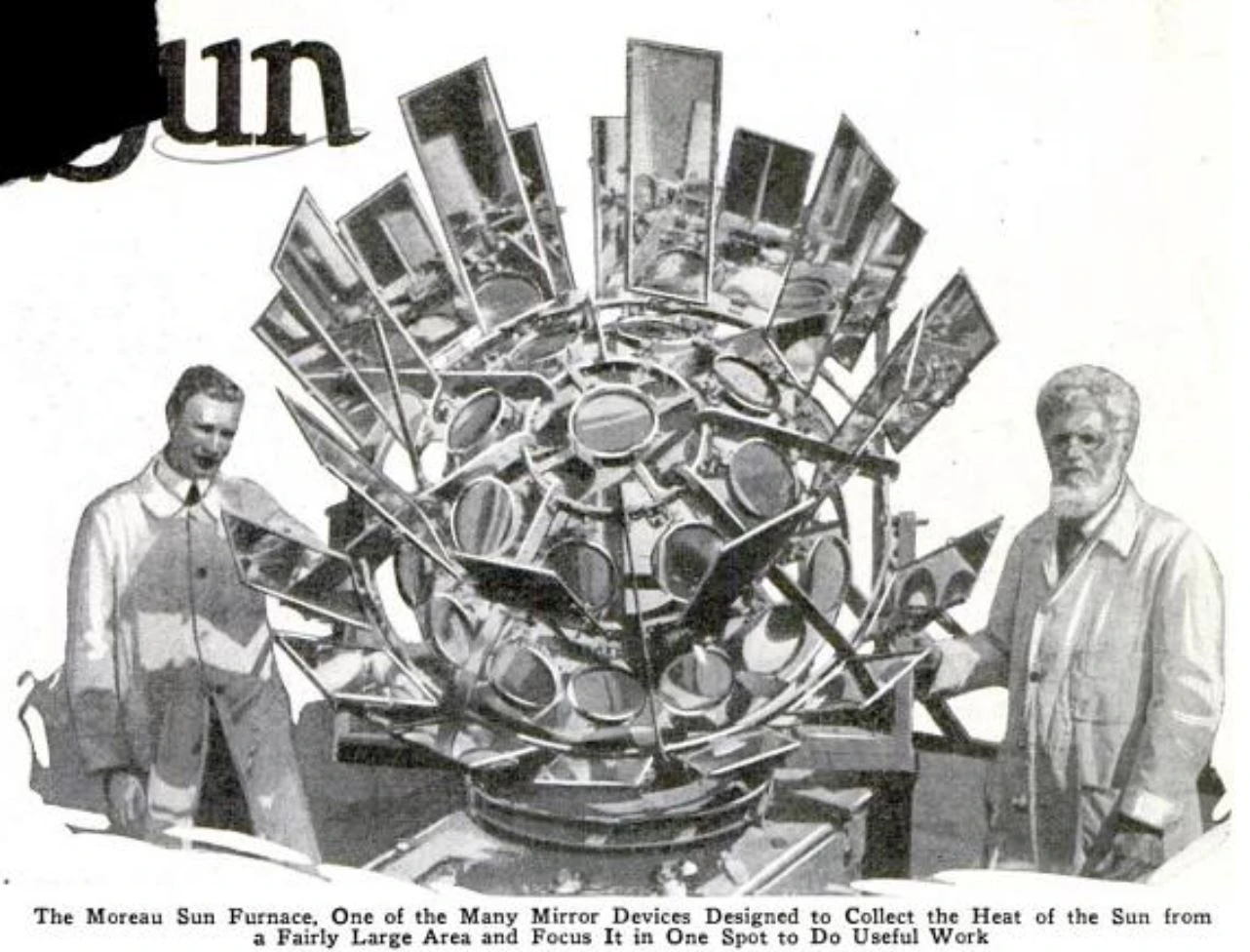 The Moreau Sun Furnace, circa 1923, is one of the many mirror devices by Marcel Moreau designed to collect the heat of the sun from a fairly large area and focus it in one spot to do useful work