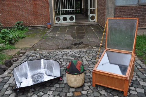Pictured from left to right are a CooKit solar panel cooker, a heat-retention cooker, and a wooden solar box cooker.