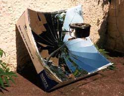 The hot plate solar cooker is a parabolic solar power cooker with a wooden or cardboard base and high refraction index reflectors. This solar cooker can reach high temperatures, around 300 ºC, similar to those reached in a conventional cooker. Its parabolic shape is due to 11 "barillas", made of cardboard or wood, that form the base, and where the reflecting aluminium is placed. Plans are freely distributed, although the construction of the cooker requires some skills and specific tools. The materials for the base, mainly cardboard or cardboard and wood, are easy available anywhere, but the reflecting surface may be a problem in some populations (lack of material, costs). To construct the grill forge skills may be needed , as well as carpentry skills if the base is made of wood.