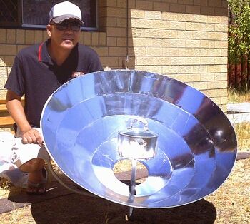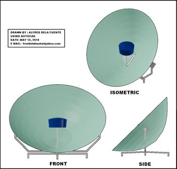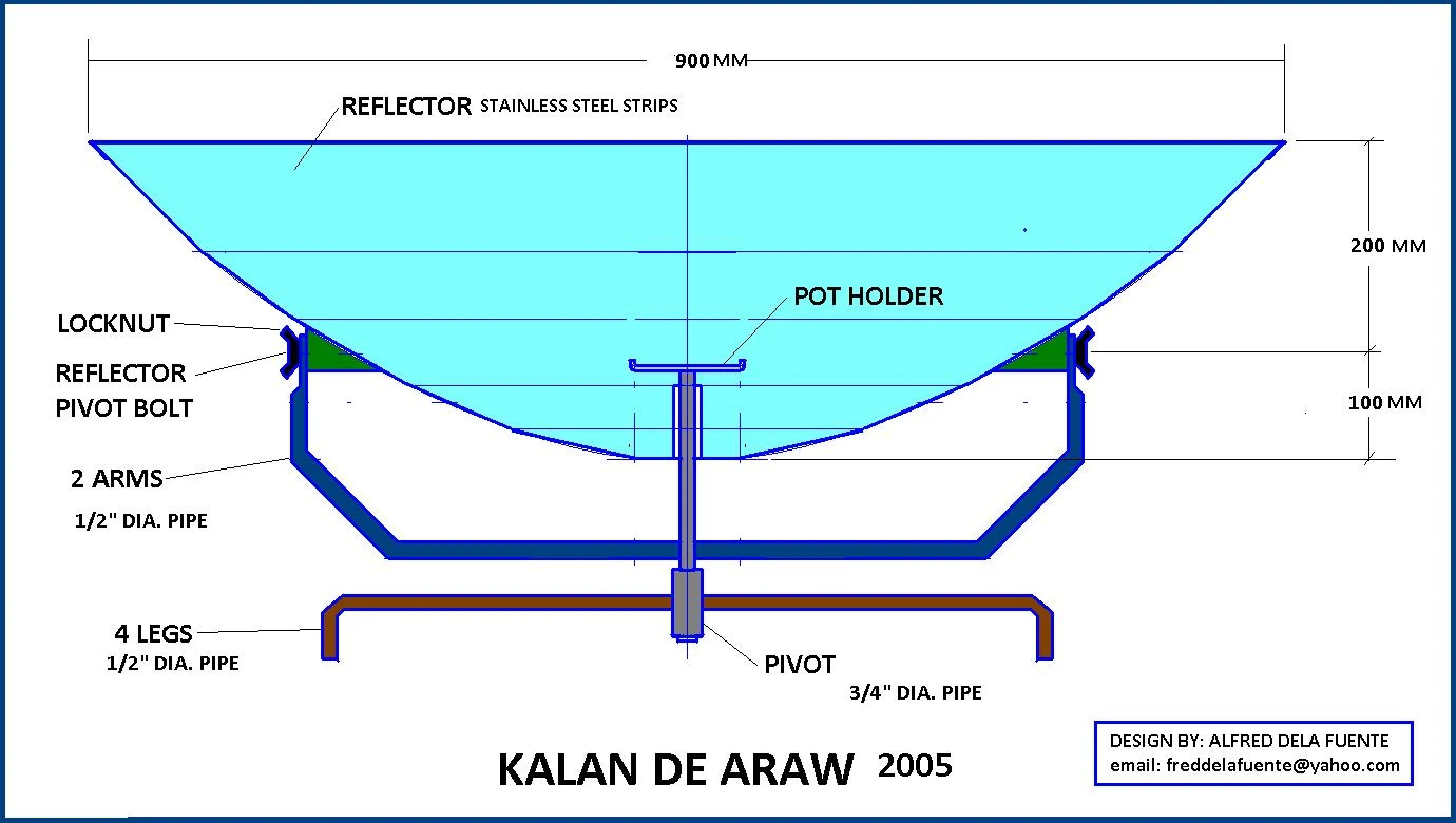 The reflector of the Kalan de Araw is composed of six pieces cut stainless steel mirror surface sheet, welded (the thin blue horizontal line) or brazed together to form a parabolic reflector (strips is a cone strip from analytic geometry) or a composite of galvanize sheet and aluminum foil. The reflector can be rotate vertically and fixed by the loosening and tightening of the lock nut. It can rotate horizontal rotation at pivot. Two arms and holder for the pot are welded together. The four legs are welded to the pivot pipe. The Kalan de Araw is actually three pieces, the reflector to arm by lock nut, insert arm and pot holder to pivot with leg. You could put weight on the leg to prevent from moving and tie the reflector during windstorms. The reflector could be easily rotate on three axes because the center of gravity is approximately at the focus of the reflector and where the light is concentrated.