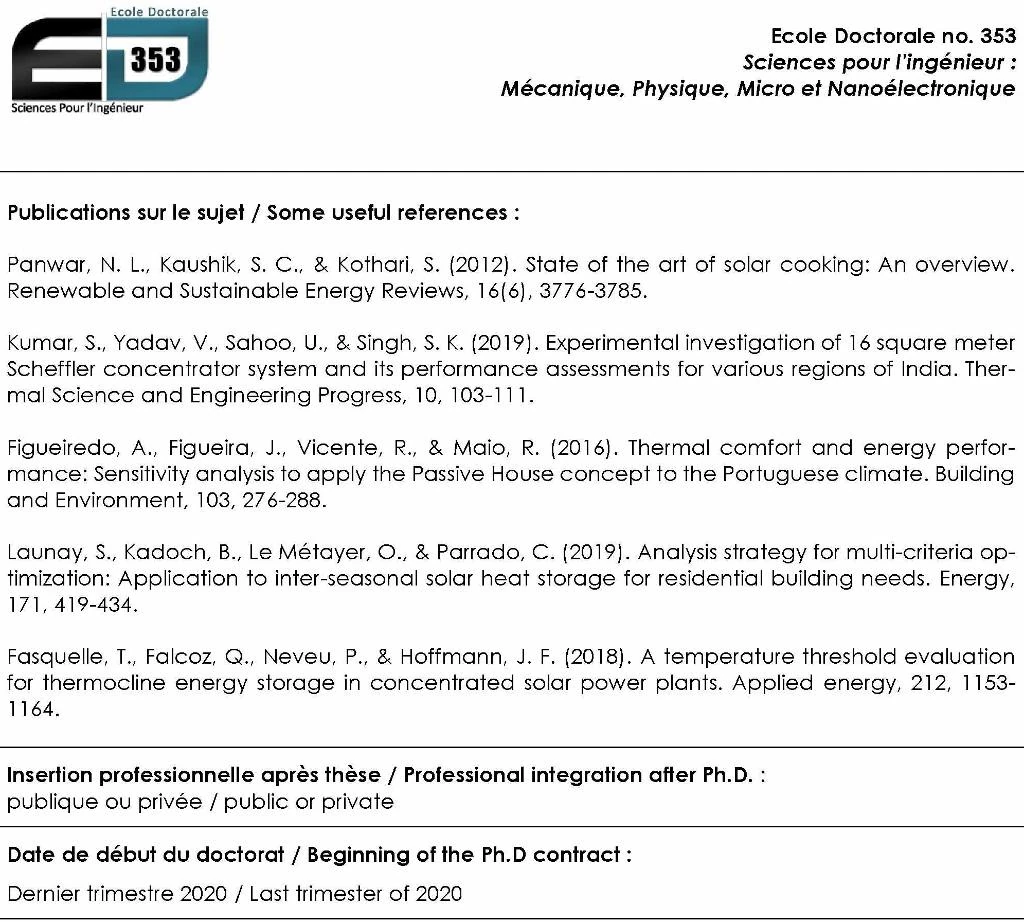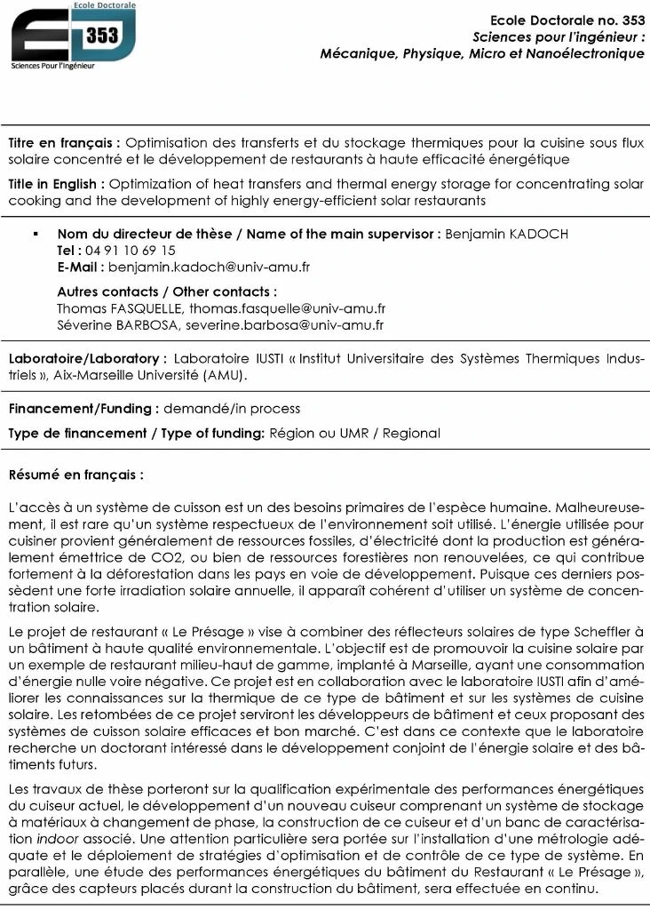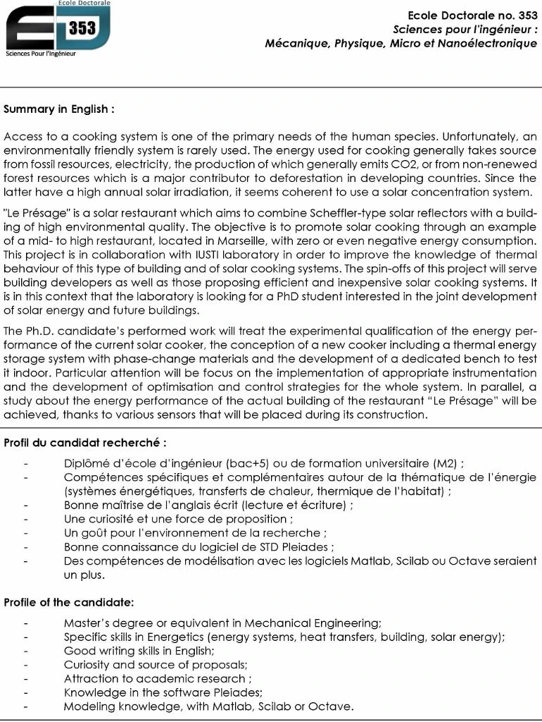 - April 2020: Setting up the transition restaurant Pierre-Andre Aubert, solar chef, is setting up a solar restaurant - Le Présage - in Marseilles, France. He is collaborating with the local university to sponsor a PhD in restaurant-scale solar cooking, heat retention, and passive solar heating.