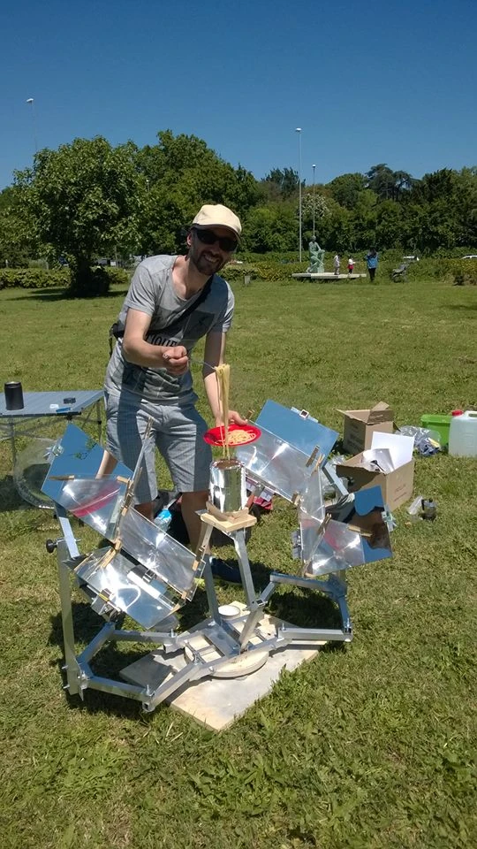The MUMA Solar Cooker, designed by Matteo Muccioli, is composed of four Fresnel lenses and four plane mirrors. It is designed to be transportable and easily reproducible. The idea is to use a system of orientation and positioning that is integrated into the same structure as the cooker, in that way, once focused, it is easy to turn as a unit to follow the sun.