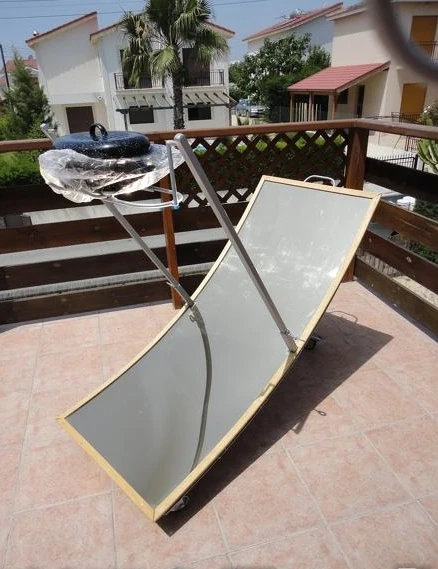 The Pana Cooker is a solar cooker created by Kyriakos Antoniou. It incorporates a simple framework, and a convenient cooking surface height. The reflector is mounted on castors for easily reorienting the unit to the sun.