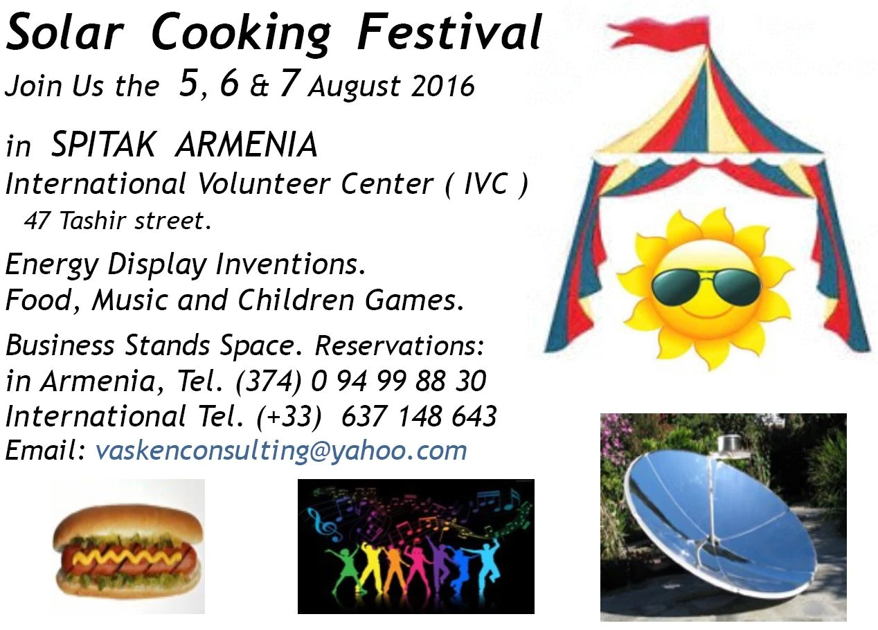 - 5-7 August 2016: Spitak Solar Cooking Festival - Guests will be able to stay for free at the Center in Spitak (donation are appreciated). The guests will need to pay for their own food. Spitak is 100 km. North of the capital Yerevan. Bus transport is available. For more information write vaskenconsulting@aol.com.