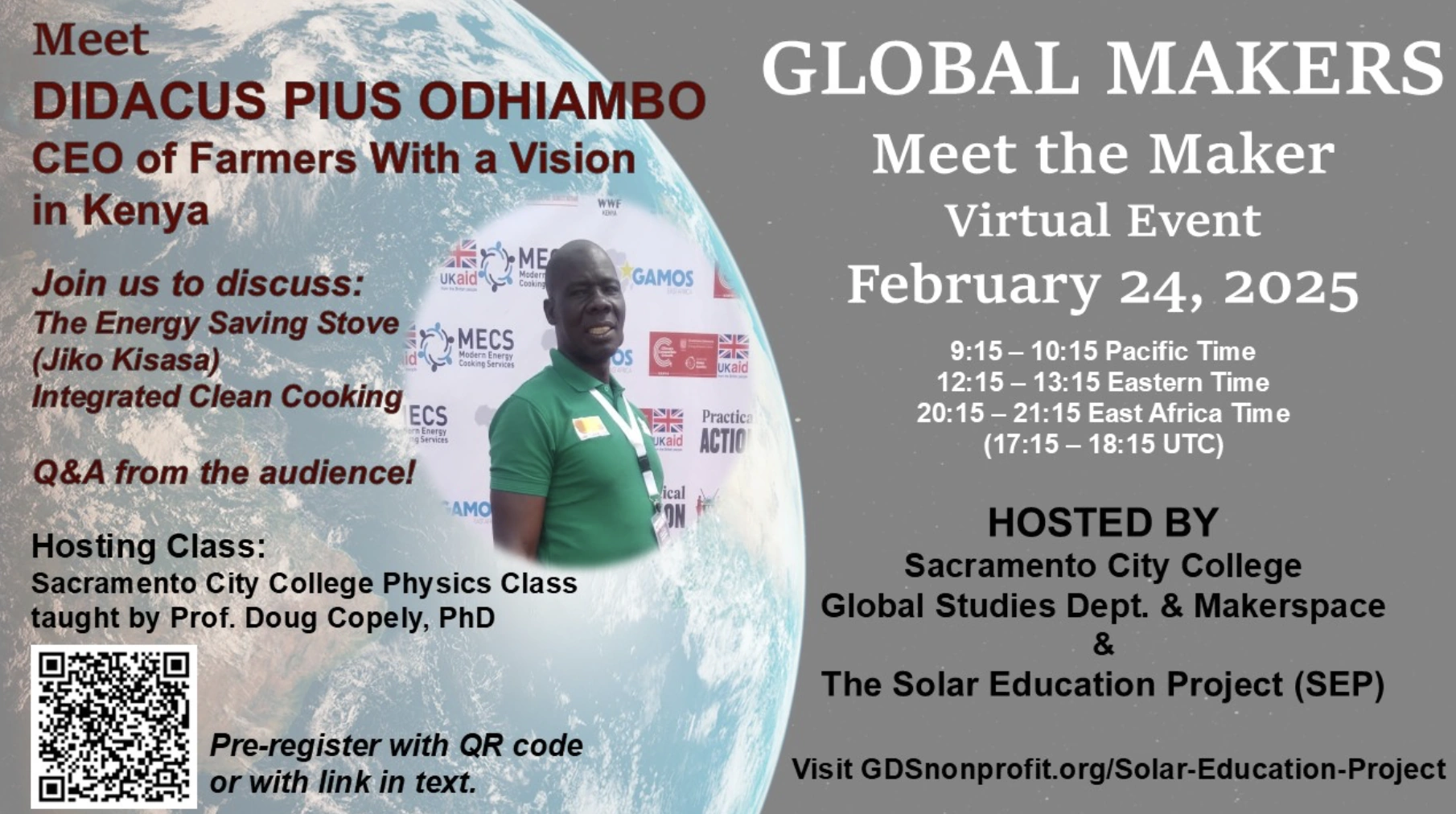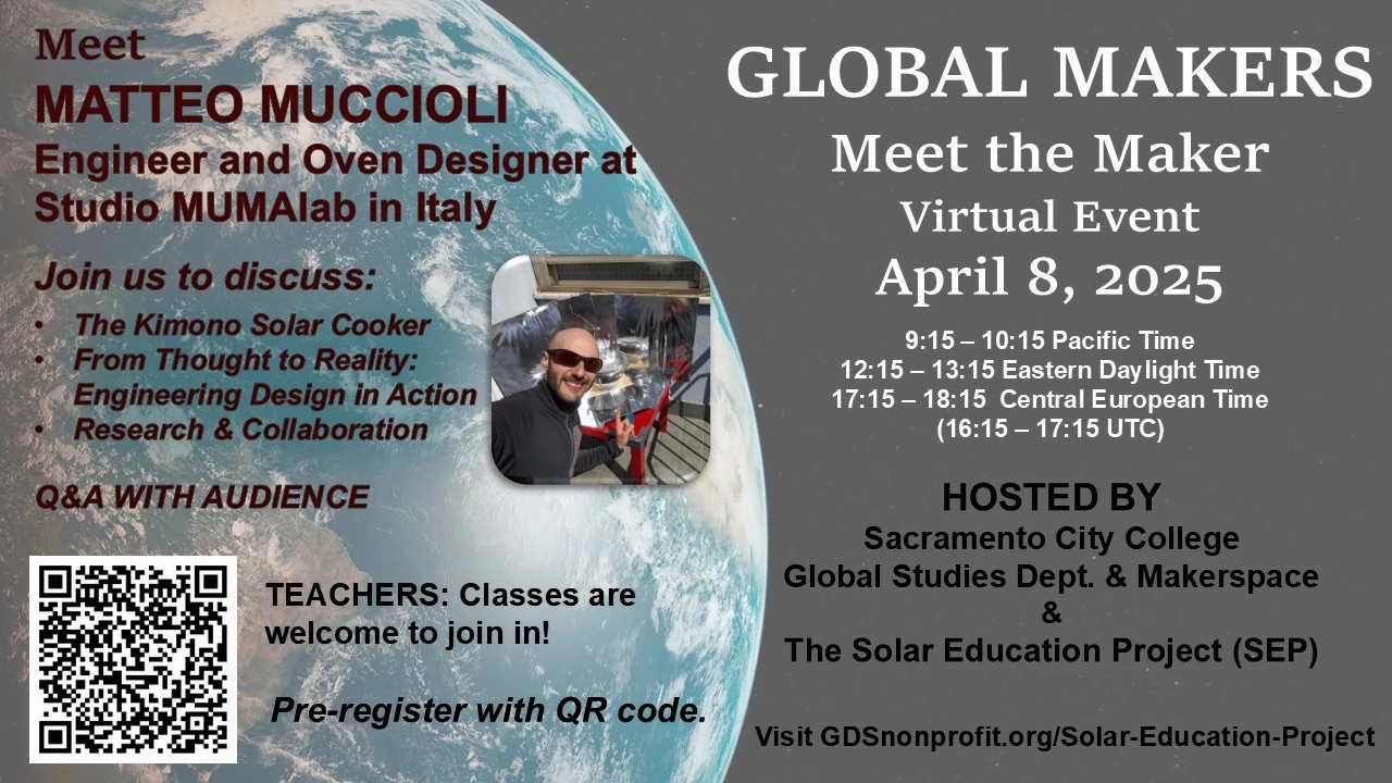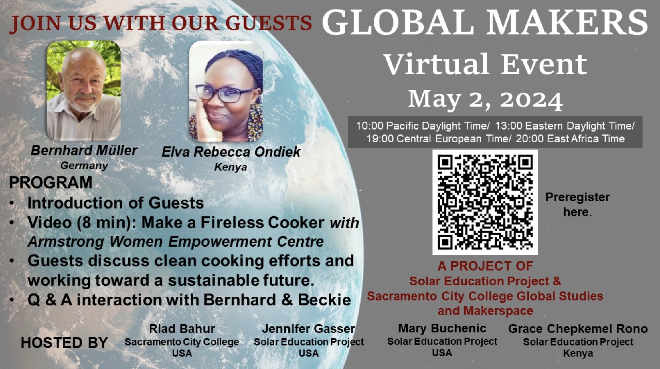 - Thursday, 2 May 2024 (10am PDT, 1pm EDT, 19:00 CET, 20:00 East Africa Time): GLOBAL MAKERS Virtual Event: Interviewing solar cooking advocates - Guests, Bernhard Müller and Elva Rebecca Ondiek, discuss clean cooking efforts, and working toward a sustainable future. Scan QR code on poster for registration information (click image to increase size if neccessary). This presentation is a collaboration by: Solar Education Project, Sacramento City College Global Studies, and Makerspace.
