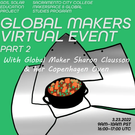- Wednesday, 23 March 2022, 9:00am-10:00am PST, 16:00-17:00 UTC: Global Maker Space Zoom Event - This event will feature an interview with Sharon Clausson, designer and manufacturer of the Copenhagen Solar Cooker Light, hosted by Sacramento City College's Global Studies Program and the Solar Education Project. Register for this free Zoom event