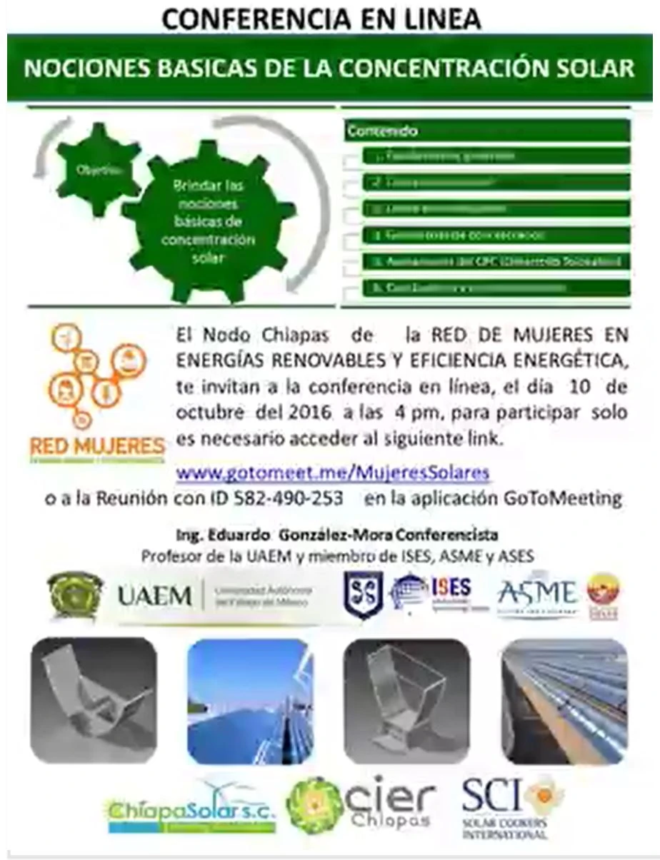 - 10 October 2016 - 22:00 GMT (16:00 Central Time - Chiapas): Nociones basicas de la concentración solar.