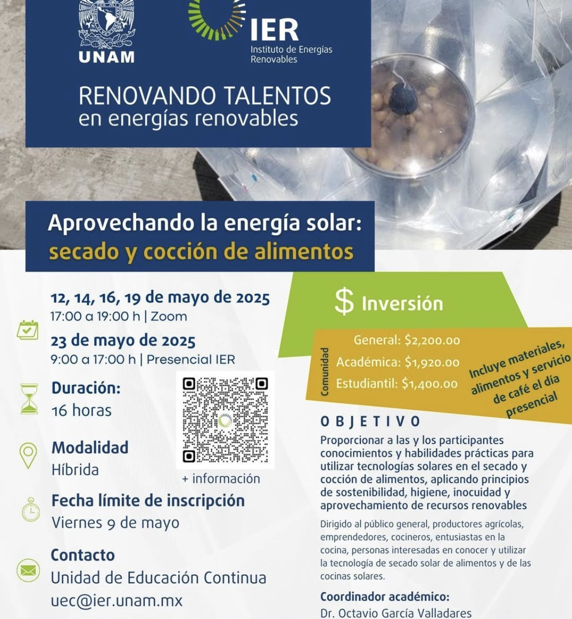 - 12, 14, 16, 19 May, 2025 (17:00 a 19:00 h|Zoom) (23 May, 2025, (9:00 a 17:00 Presencial IER), Morelos, México - Solar Energy Course at UNAM's IER. Join the Renewable Energy Institute for the course "Harnessing Solar Energy: Food Drying and Cooking," where you'll learn how to use solar technologies sustainably and effectively. Duration: 16 hours | Modality: Hybrid. Registration deadline: May 9, 2025, Contact: uec@ier.unam.mx Click image for more information...