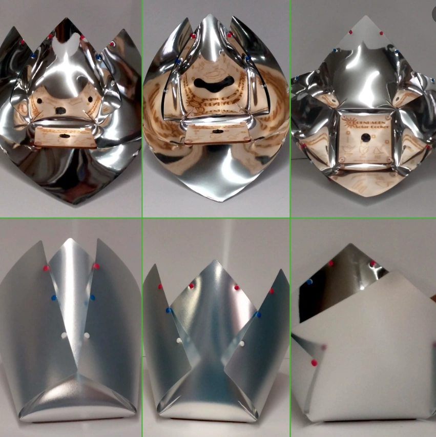 - October 2023: Adjusting the Copenhagen Solar Cooker reflectors for high and low sun angles - Sharon Clausson has shared photos showing how the new reflector snap arrangement on the Copenhagen Solar Cooker provides the best solar orientation at different times of the day.